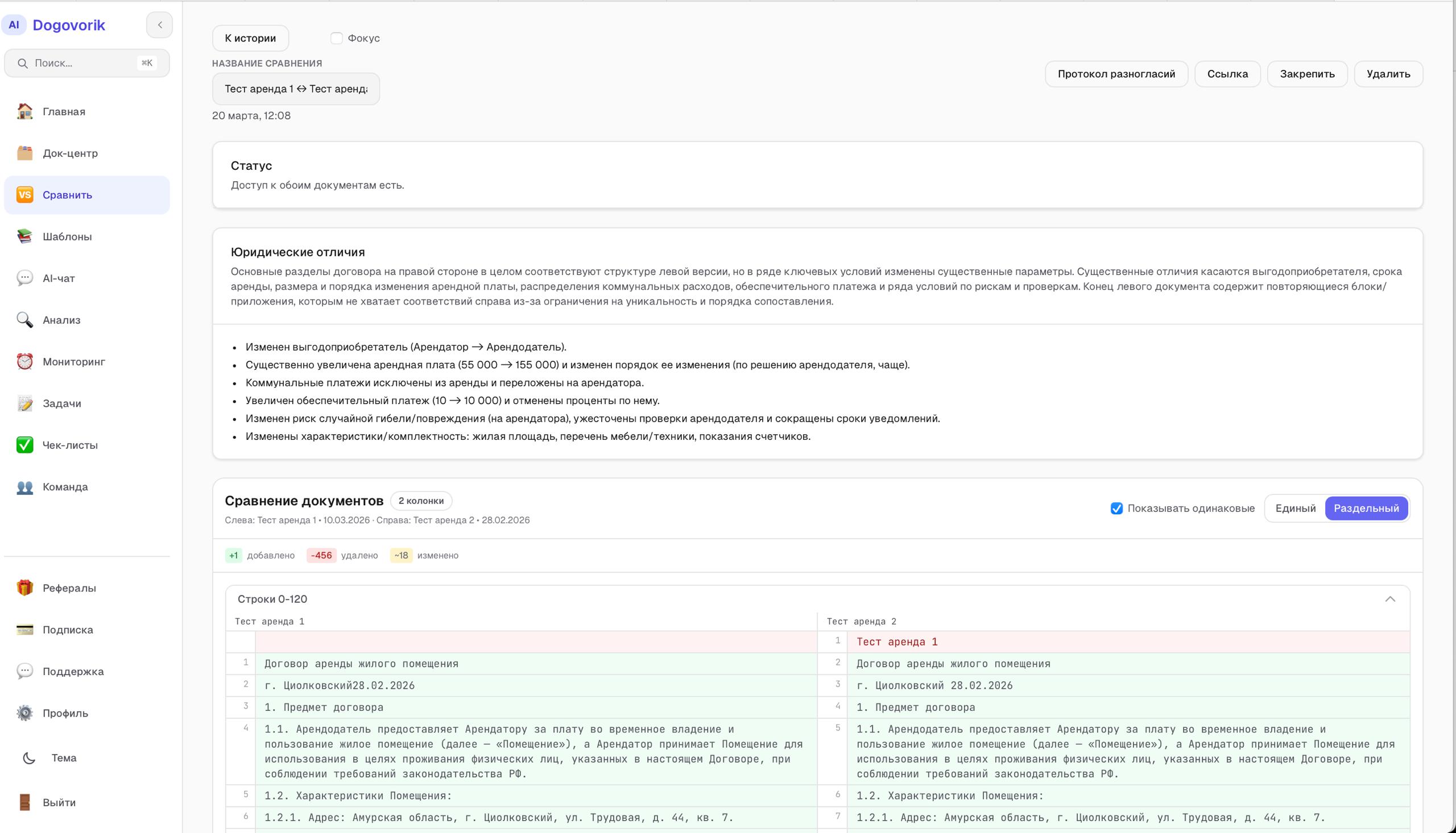 “Единый/Раздельный”, фильтр одинаковых строк и блок “Юридические отличия” помогают быстро понять, что реально поменялось.